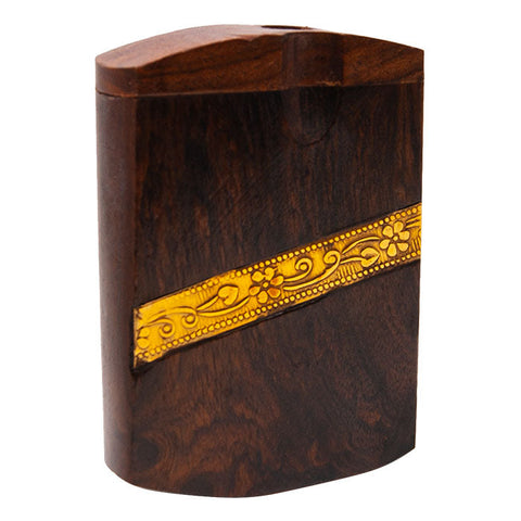 This is wooden dugout with golden strip having size 3 inches. It comes with one hitter. This box is designed into two separate sections. The slide out section of the box stores one hitter and is spring-loaded so the one-hitter pops out. Also, you can hold some cannabis in other separation of the wooden box.
