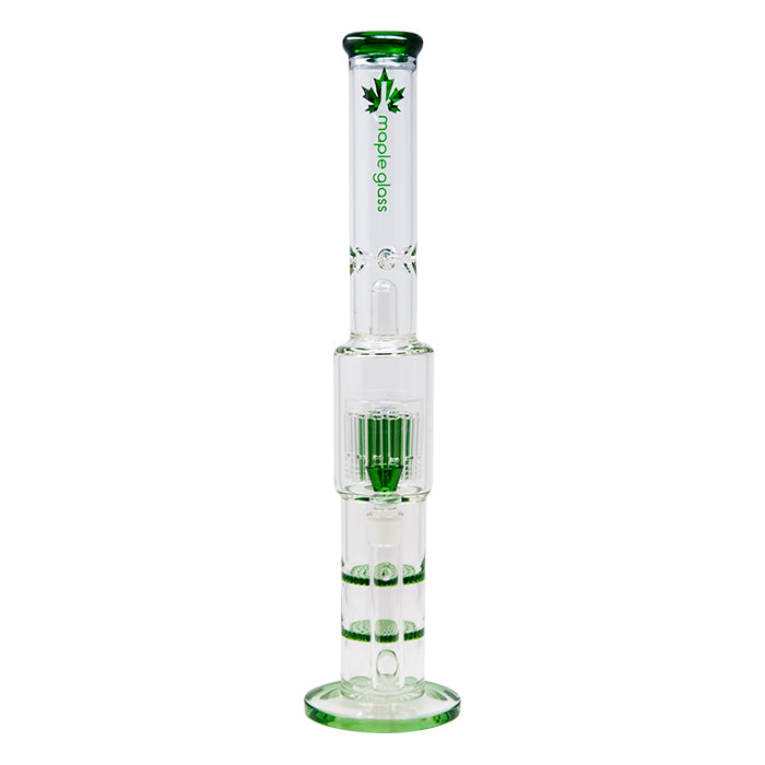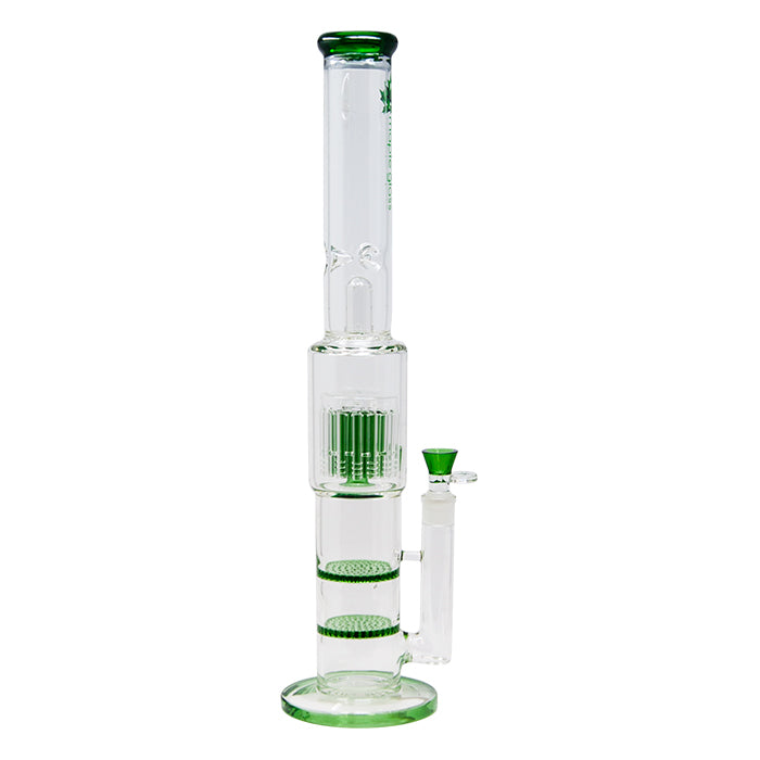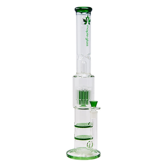 Green Maple Glass Double Honey Comb Perc With Tree Perc And Splash Guard 20 Inches tall comes with matching color bowl. The bong has 19mm joint size. It has ice catchers as well which gives you cool smoke. It has bunch of tree percolators that makes it cool. The two honey comb perc gives you more filtration. Moreover, its has splash guard. It is made very heavy glass having weight 1430Gm.