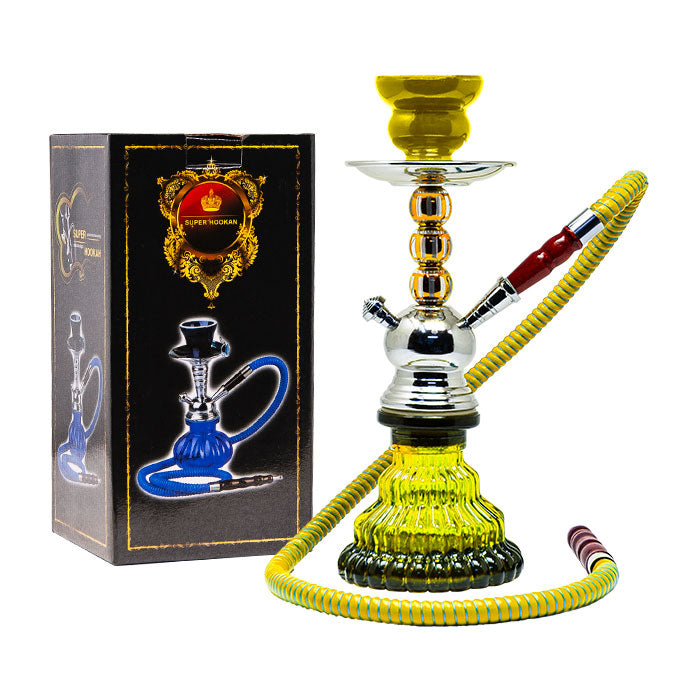 This hookah set comes with yellow washable ceramic bowl, yellow silicone/rubber hose with wooden handles, ash tray, and a tong.  You just need to get coals and hookah tobacco to enjoy smoke with it.
