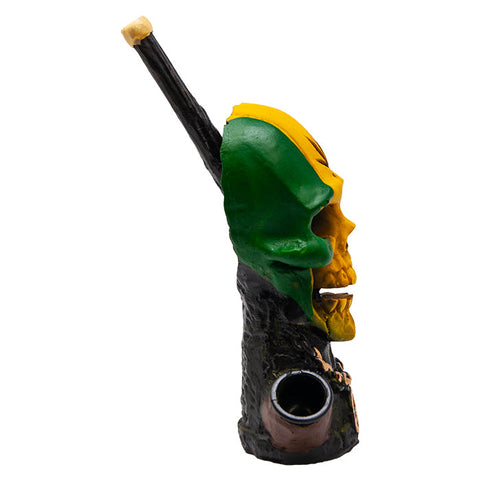 The Peace Skull pipe is painted green, yellow, and red. This pipe has a marijuana leaf on the skull’s forehead which 420 lovers would rave over! The skull also has a gold chain around its neck that has a peace symbol on it. The Weed Skull pipe gives very easygoing and happy vibes which is why it is a hit amongst customers! This pipe is 6 inches in size which makes it very portable and convenient.