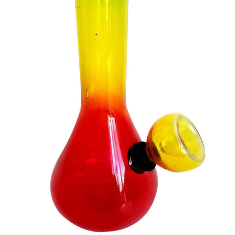 Rasta-colored glass water pipe. With matching glass bowl. Comes in one color. Height of this bong is approximately 7 inches and holds a thickness of about 4.9mm.